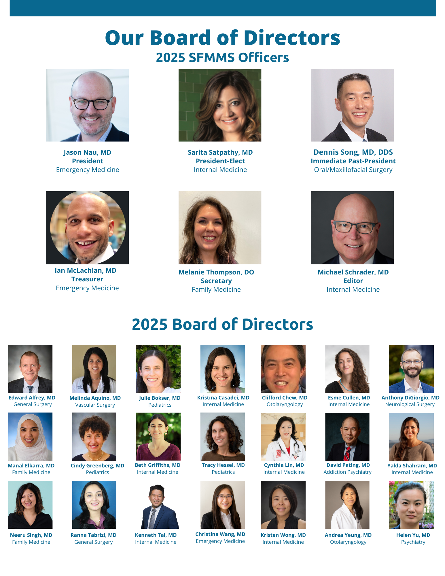 The people of SFMMS are what make this organization strong. Our members—physicians, residents, and medical students—are committed to championing physicians’ rights while building a stronger, more unified health care community in San Francisco and Marin.